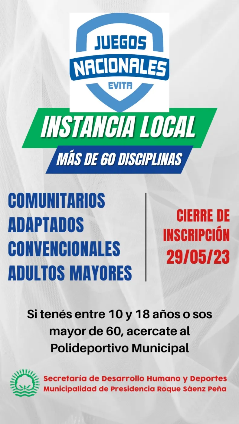 Hasta el 29 de mayo, se encuentran abiertas las inscripciones para participar de las instancias locales de los Juegos Nacionales Evita 2023, organizado por la Subsecretaría de Deportes y auspiciado por la Municipalidad de Sáenz Peña.