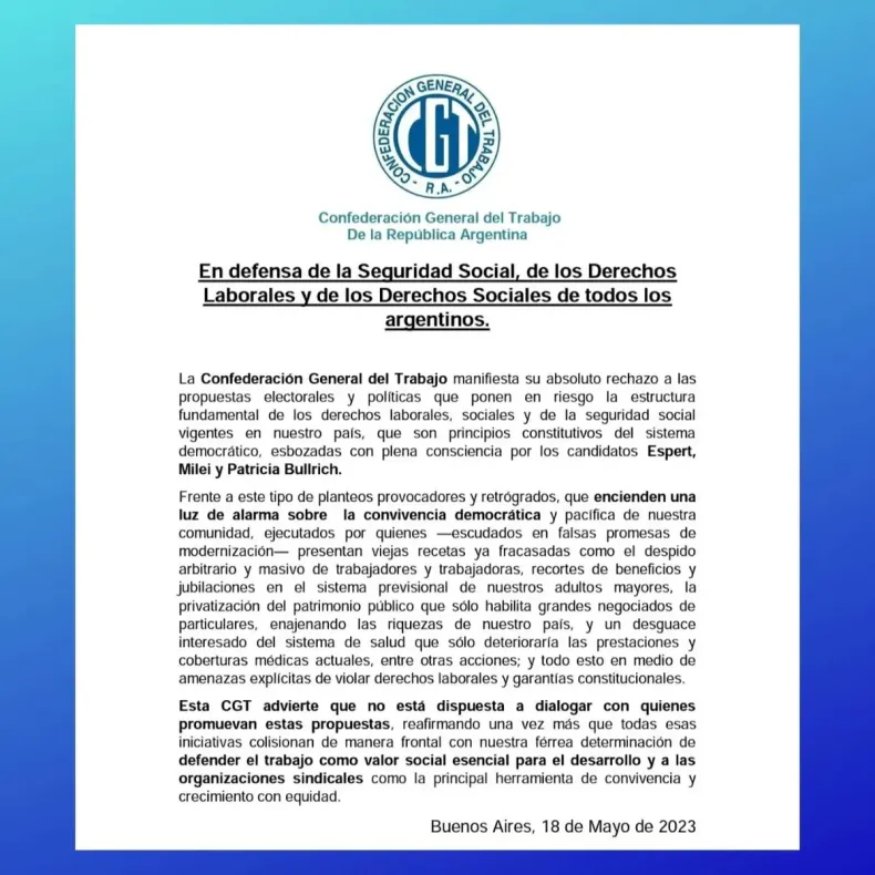 La central sindical lanzó un comunicado en donde dejaron en claro su contrario posicionamiento a las propuestas lanzadas por los precandidatos de la oposición, puntualmente sobre Patricia Bullrich, Javier Milei y José Luis Espert. La publicación tuvo lugar el jueves 18 de mayo.
