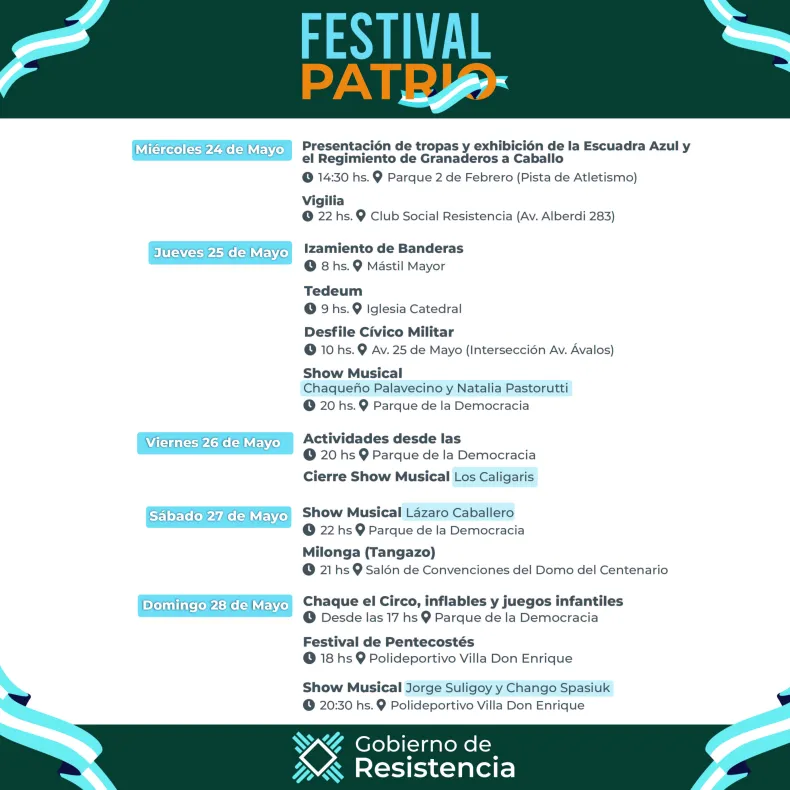 El Municipio de Resistencia prepara una agenda de espectáculos y eventos que tendrán lugar desde el miércoles 24 hasta el domingo 28. El gobierno de la ciudad ha preparado múltiples actividades que, además de celebrar un aniversario más de la gesta del 25 de mayo de 1810.