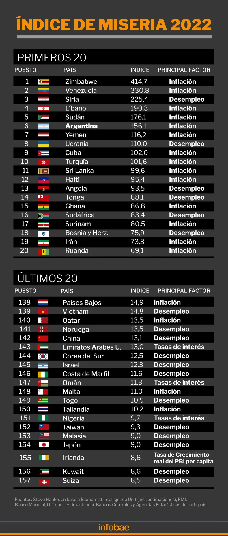 El economista, Steve Hanke, publicó el jueves la edición nueva de Hanke Annual Misery Index, basado en datos obtenidos en el año 2022. En esta publicación, Argentina vuelve a hacerse presente en el sexto lugar, como uno de los países con mayor penuria o "miseria".