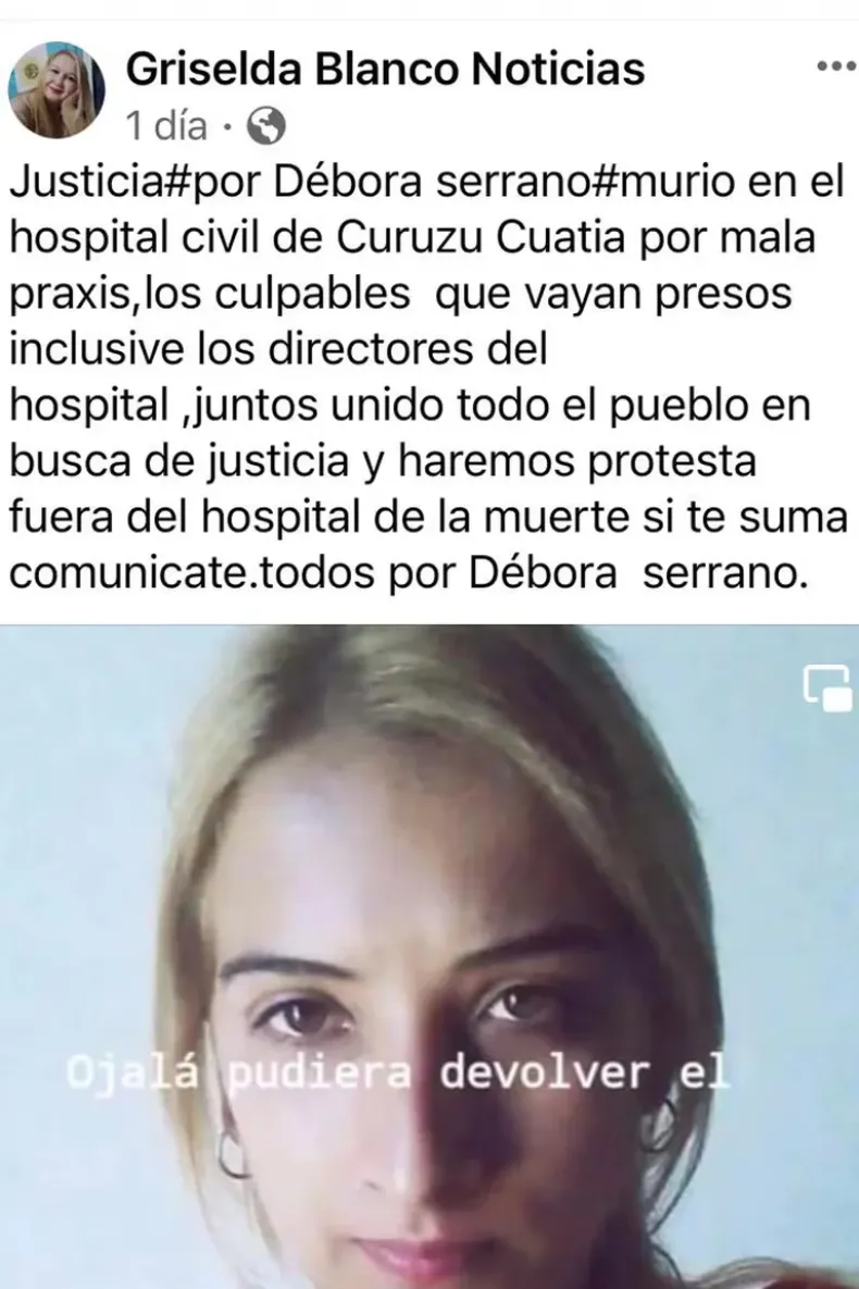 Durante la madrugada del sábado pasado, después de las 2, Blanco había hecho un posteo en su cuenta de Facebook donde pedía justicia por ella. "Justicia por Débora Serrano. Murió en el hospital civil de Curuzú Cuatiá por mala praxis, los culpables que vayan presos, inclusive los directores del hospital. Juntos, unidos, todo el pueblo en busca de justicia y haremos una protesta fuera del hospital de la muerte. Si te sumas, comunicate. Todos por Débora Serrano", fue su última publicación, junto con un emotivo video recordatorio de su amiga.