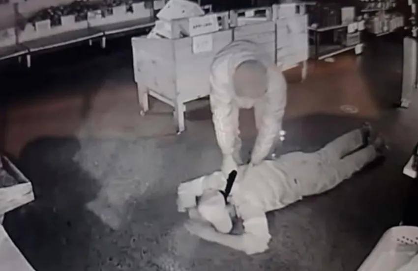 La escena siguió cuando la víctima terminó en el suelo luego de ser empujado por uno de los delincuentes, mientras el otro fue hasta el mostrador, robó la caja fuerte y se fue directo a la moto donde lo esperaba un tercer ladrón.