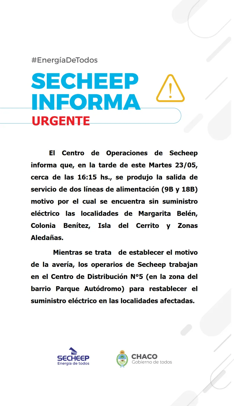 En este comunicado, se informó que este martes a las 16:15 se produjo la salida de servicio de dos líneas de alimentación y por ello, las localidades de Margarita Belén, Colonia Benítez, Isla del Cerrito y zonas aledañas se encuentran sin suministro eléctrico.