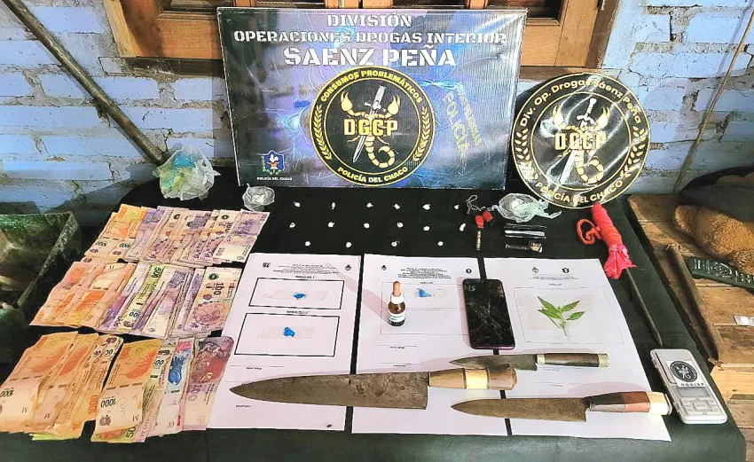 En total, los agentes hallaron 17 dosis u restos compactos de Cocaína, arrojando el peso de 11 gramos, una planta cannabis sativa de 8 cm de alto, dinero por la suma de $ 35.790, varios recortes de bolsas, un celular, 3 cuchillos de distintos tamaños y un hierro afilado conocido comúnmente como una "chuza"