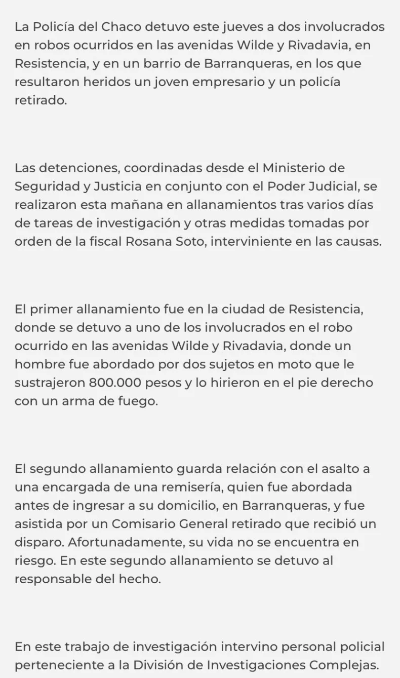 "La Policía del Chaco, por disposición del Ministerio de Seguridad y Justicia de la provincia, trabajó para resolver los robos ocurridos en avenidas Wilde y Rivadavia en Resistencia, y otro ocurrido en un barrio de Barranqueras, donde resultaron heridos un joven empresario y un policía retirado. Las detenciones se realizaron esta mañana (por la de ayer) en allanamientos, tras varios días de tareas de investigación y otras medidas tomadas por orden de la fiscal Rosana Soto, interviniente en las causas", sostuvo el comunicado oficial emitido.