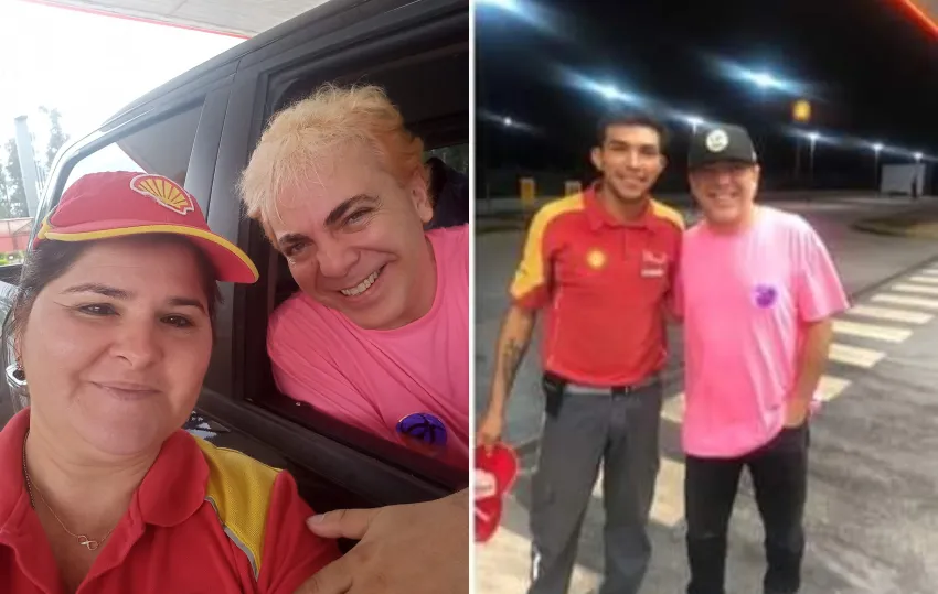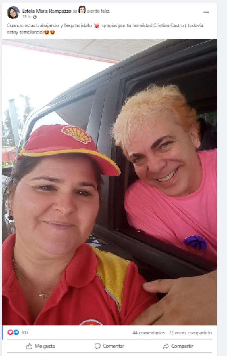 "Cuando estás trabajando y llega tu ídolo, gracias por tu humildad Cristian Castro (todavía estoy temblando)", dijo una mujer llamada Estela Maris que trabaja en la estación de servicio y pudo lograr la foto con a quien ella define como su ídolo.