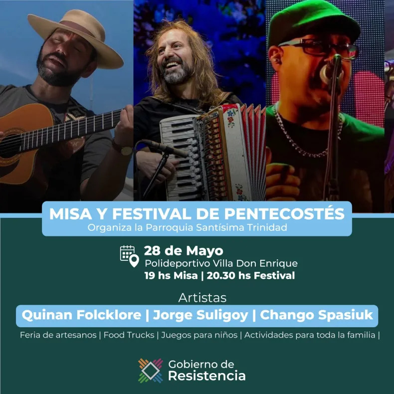 Finalmente, en el Polideportivo de Villa Don Enrique se realizará el festival de Pentecostés. El mismo dará inicio con la misa, desde las 19, y finalizará con distintos números folklóricos que tendrán el cierre estelar del Chango Spaciuk.