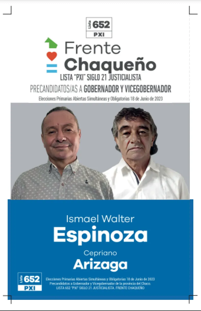 La fórmula está integrada por Ismael Walter Espinoza y Cepriano Arizaga como vicegobernador.