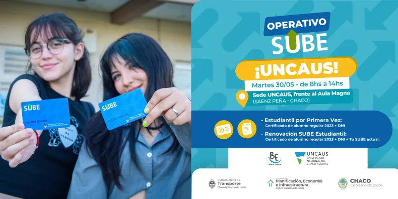 El Ministerio de Planificación, Economía e Infraestructura, informa que este martes 30 de mayo, la Subsecretaría de Transporte llevará a cabo un operativo SUBE en la Universidad del Chaco Austral (UNCAus) de Presidencia Roque Sáenz Peña. La actividad, que se llevará a cabo de 8 a 14 frente al Aula Magna, será exclusivamente para estudiantes de esta institución que deseen realizar el trámite por primera vez o para renovación.