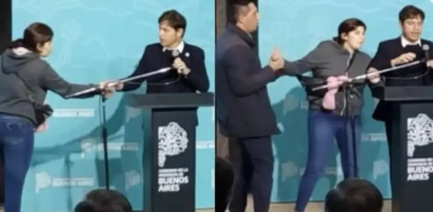 En la mañana de este jueves, el gobernador de la provincia de Buenos Aires, Axel Kicillof, sufrió un incidente cuando una mujer subió al escenario en donde él se encontraba hablando e interrumpió su discurso.