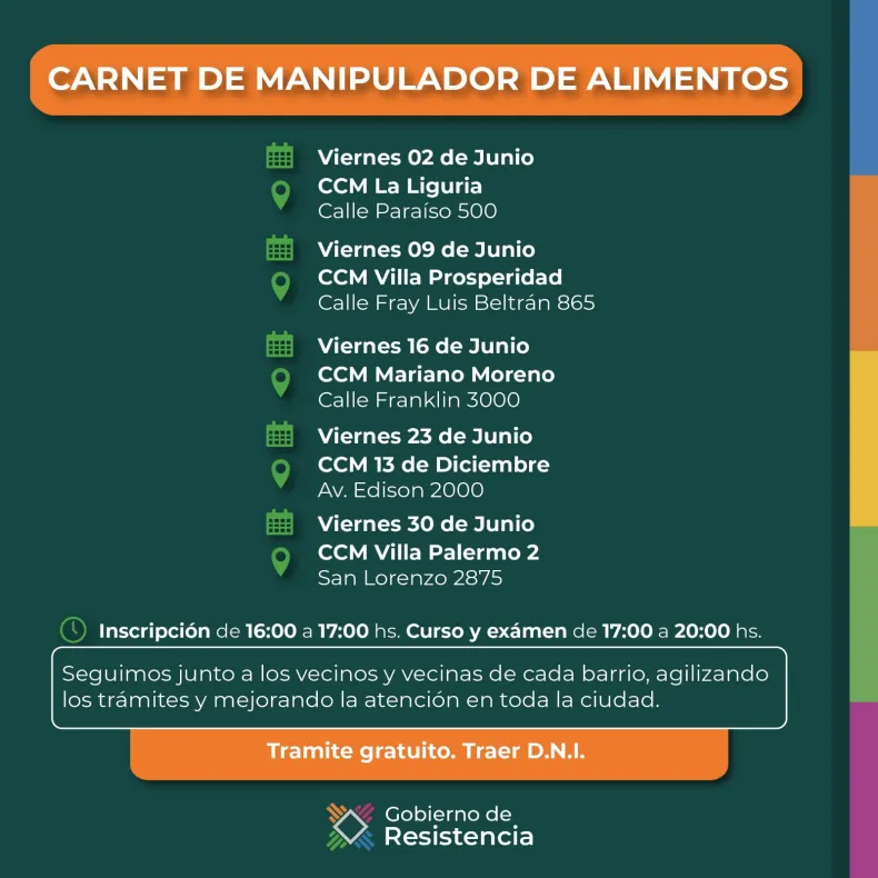 Como parte del proceso de descentralización de los servicios que lleva adelante el gobierno de la ciudad de Resistencia informa que los cinco viernes de junio se realizarán los operativos en distintos CCM de la ciudad; instancia donde quienes estén interesados podrán acceder a la capacitación necesaria y realizarán el examen que los habilitará como manipuladores de alimentos.