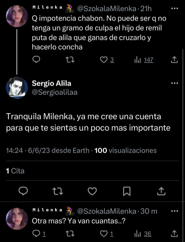Además, tuvo un cruce mediante esta red con una cuenta que pertenecería a Alila y mediante un tweet, le aseguraba a Milenka, quien realizó las publicaciones, que él habría creado la cuenta de twitter para responderle a ella.