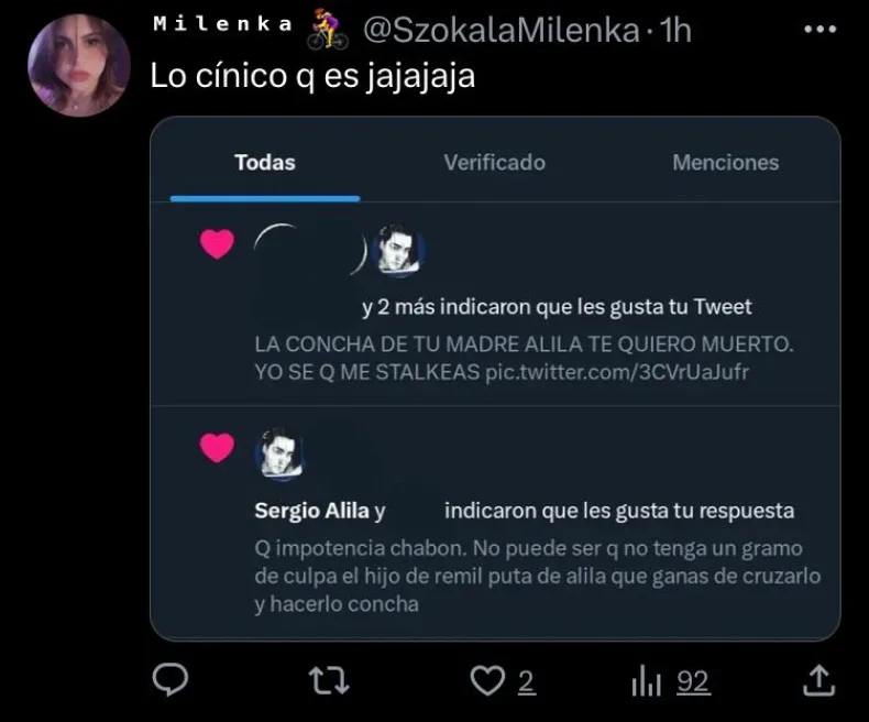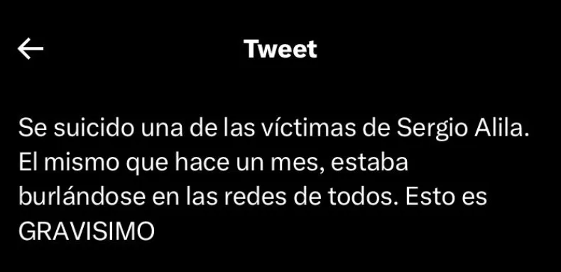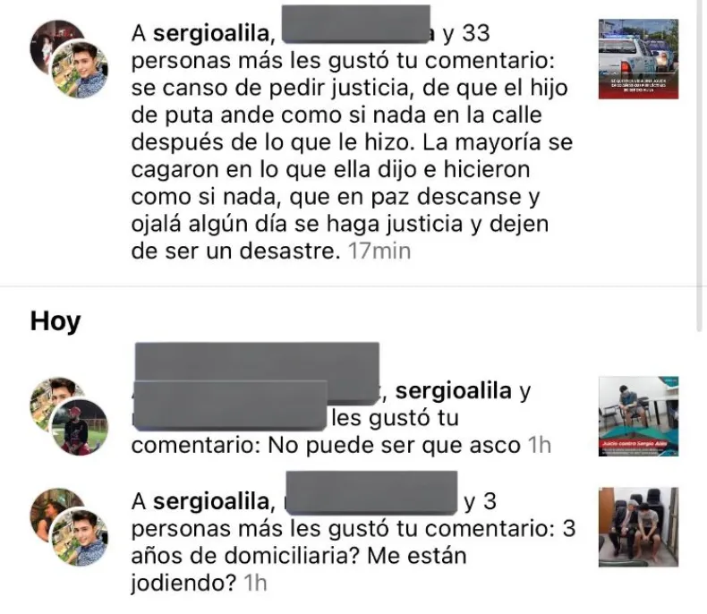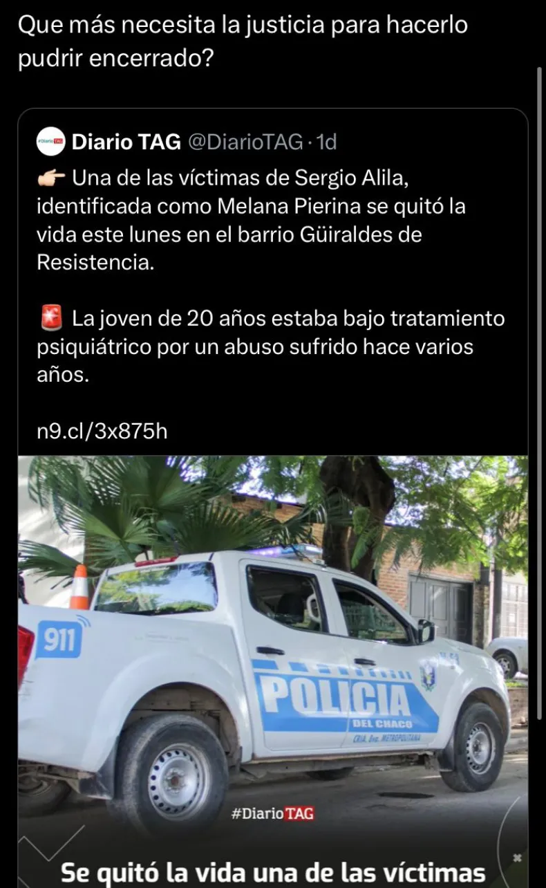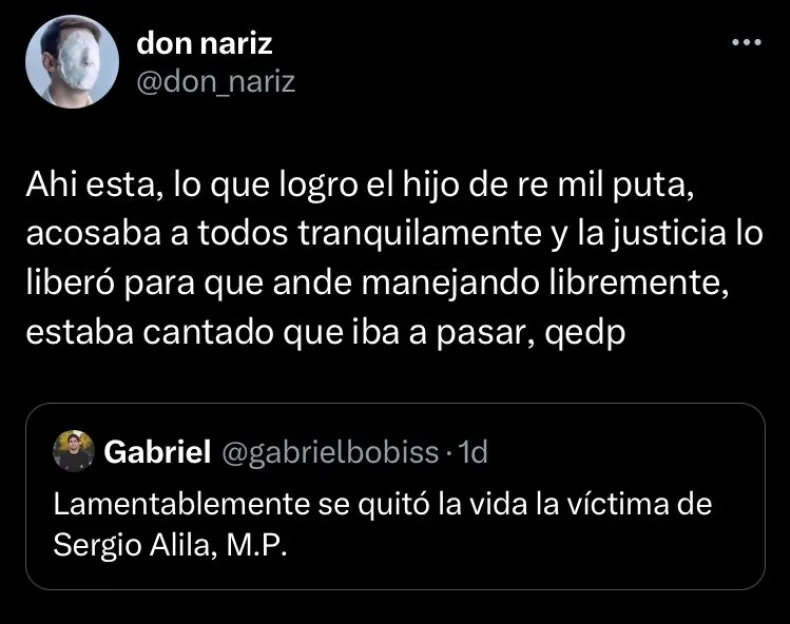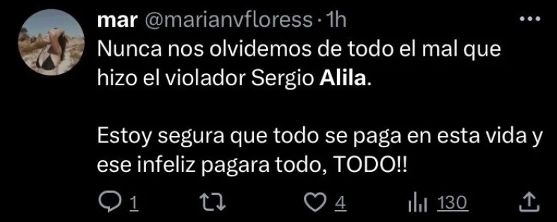 "Nunca nos olvidemos de todo el mal que hizo Sergio Alila. Estoy segura de que todo se paga en esta vida y ese infeliz pagará todo", asegura un tweet que publicó una joven de la provincia.