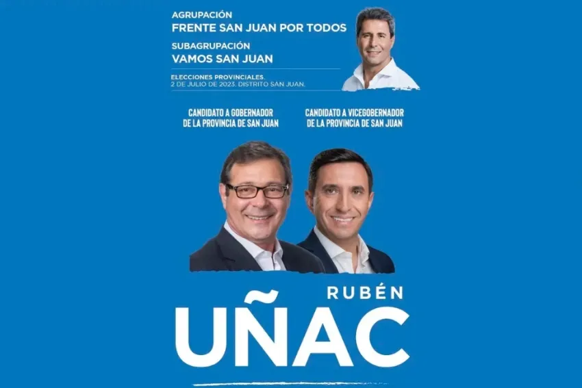 La foto de Uñac estará a la derecha de las leyendas "Agrupación Frente San Juan por Todos", "Subagrupación Vamos San Juan" y "Elecciones provinciales. 2 de julio. Distrito San Juan", que figuran en la parte superior de la boleta ahora encabezada por Rubén Uñac, cuyo compañero de fórmula es, Cristian Andino.