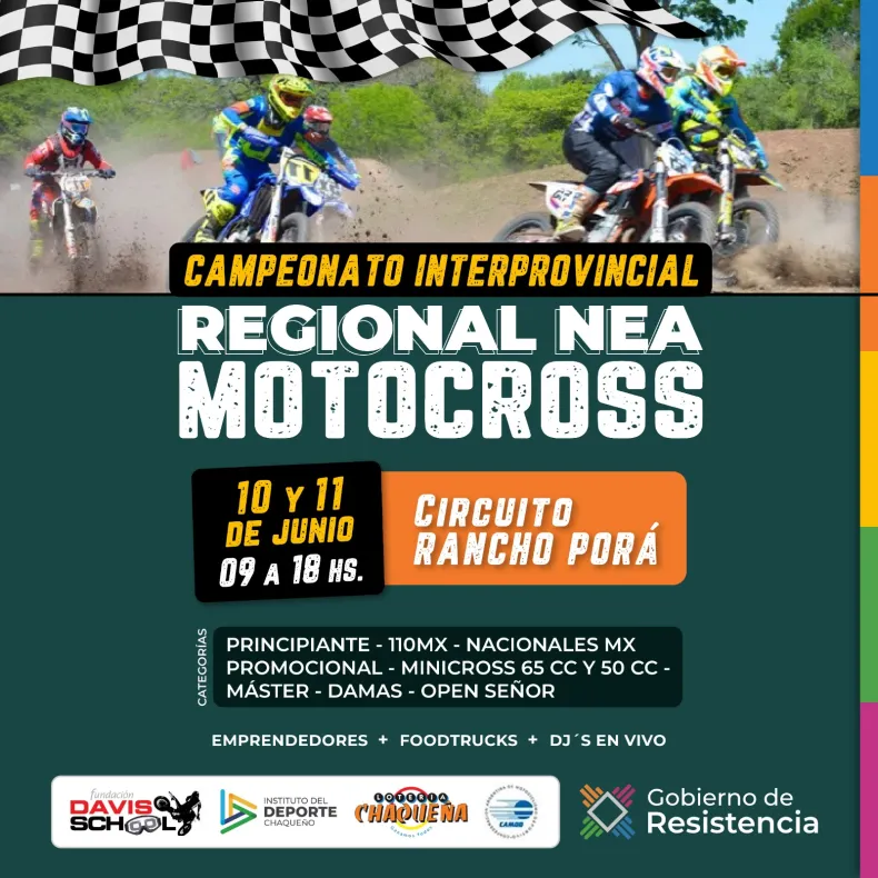 Con el respaldo de la Municipalidad de Resistencia se llevará a cabo la segunda fecha del Torneo Interprovincial de Motocross, que se desarrollará el próximo sábado 10 y domingo 11 de junio desde las 9:00 de cada jornada en el circuito de Rancho Porá, situado detrás del Sarmiento Shopping, con entrada libre y gratuita.