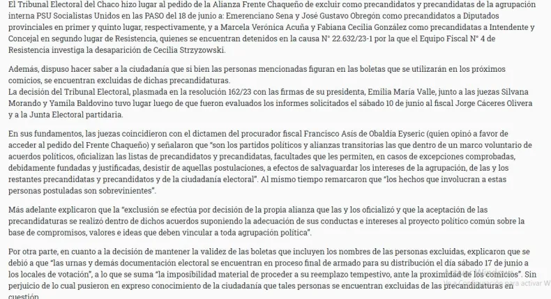 Según un comunicado emitido por el Tribunal Electoral de Chaco se informó que se dio lugar al pedido de la Alianza Frente Chaqueño de "excluir como precandidatos y precandidatas de la agrupación interna PSU Socialistas Unidos en las PASO del 18 de junio a: Emerenciano Sena y José Gustavo Obregón como precandidatos a Diputados provinciales en primer y quinto lugar, respectivamente, y a Marcela Verónica Acuña y Fabiana Cecilia González como precandidatas a Intendente y Concejal en segundo lugar de Resistencia".