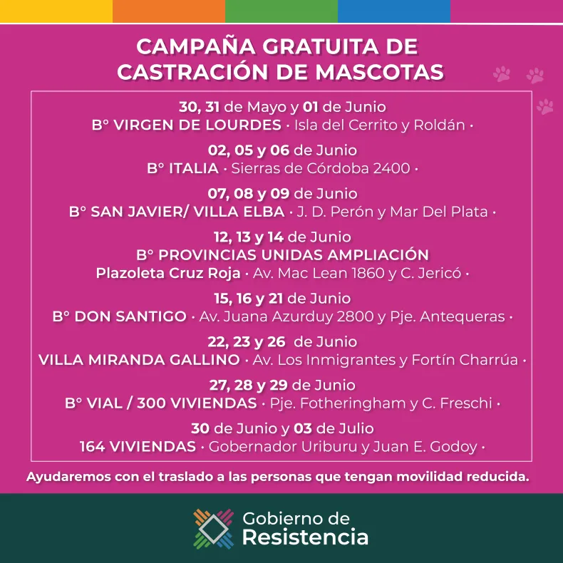 El programa de castración gratuita de mascotas que lleva adelante la Municipalidad de Resistencia se instaló este lunes 12 en el predio ubicado en la Plazoleta Cruz Roja, ubicada en avenida Mac Lean 1860, en la intersección con Jericó. La atención se llevará adelante en ese lugar, desde las 8 de cada día, hasta el miércoles 14; para luego trasladarse al Barrio Don Santiago, el jueves 15 y el viernes 16.