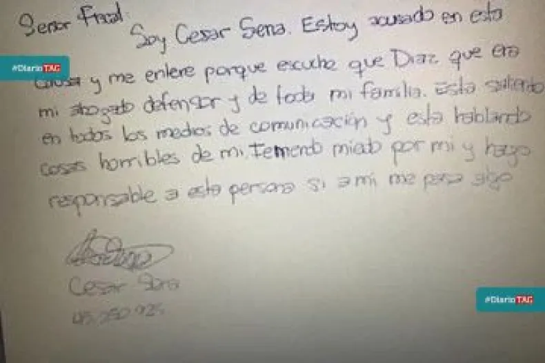 "Señor Fiscal: soy César Sena. Estoy acusado en esta causa y me enteré porque escuché que Díaz que era mi abogado defensor y de toda mi familia está saliendo en todos los medios de comunicación y está hablando cosas horribles de mí", dice la carta que al terminar culmina con su firma, aclaración y dni.