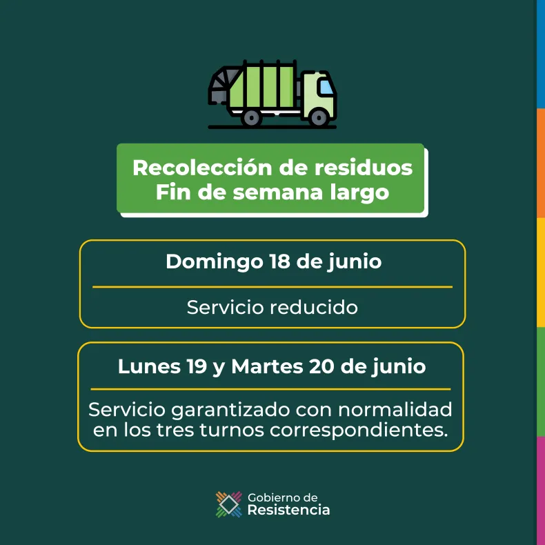 Por otra parte, este domingo 18 de junio, el servicio de recolección de residuos será reducido. Cabe señalar que en dicha jornada, además de celebrarse el Día del Padre, será la continuidad del fin de semana largo que se extenderá hasta el martes 20 inclusive.