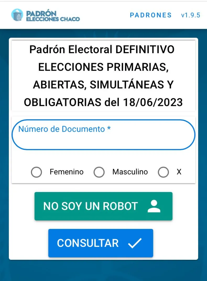 En primer lugar, se debe ingresar el número de documento de la persona que desea consultar en donde le corresponde votar. Seguido de esto, debe seleccionar el género y por último debe clickear en la opción que dice: "No soy un robot".