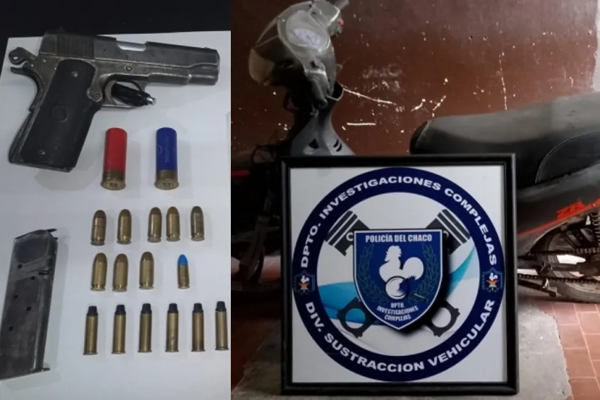 En esa línea, y con los datos aportados, el personal policial inició las averiguaciones y se logró la intervención de dos domicilios en la ciudad: uno en el Barrio Quebracho y otro en el Asentamiento 29 de Agosto. Allí, se halló un arma de fuego, un aire comprimido, un arma blanca, las prendas descriptas por la denunciante y dos motos.