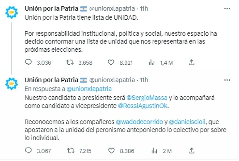 "Por responsabilidad institucional, política y social, nuestro espacio ha decido conformar una lista de unidad que nos representará en las próximas elecciones. Nuestro candidato a presidente será Sergio Massa y lo acompañará como candidato a vicepresidente Agustín Rossi", posteó en su cuenta de Twitter Unión por la Patria.