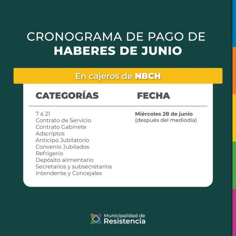 De este modo, a partir de las 12 del mediodía, se depositarán los sueldos en los cajeros electrónicos del Nuevo Banco del Chacode las categorías 7 a 21; adscriptos; contratados de servicios y de gabinete; anticipos jubilatorios; depósito alimentario, convenio con jubilados y refrigerio.