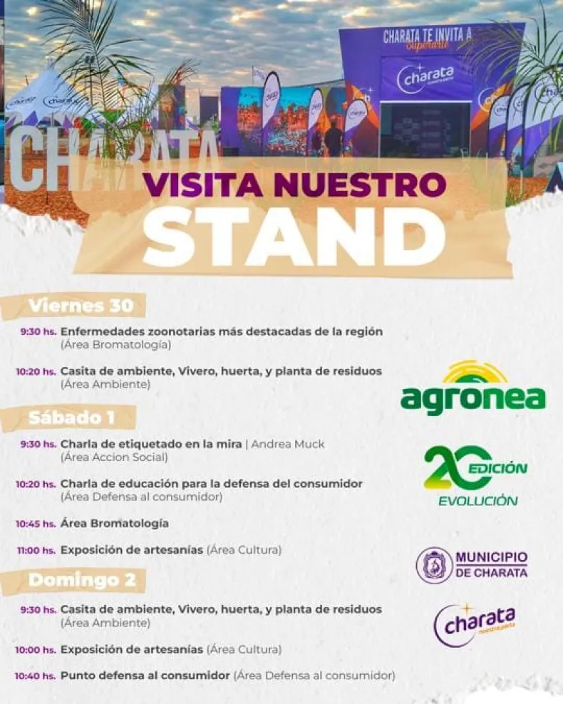 La Municipalidad de Charata difundió los stands que tendrá en el evento Agronea, que inicia este viernes 30 de junio y finaliza el domingo. Los stands iniciarán a partir de las 9.30.