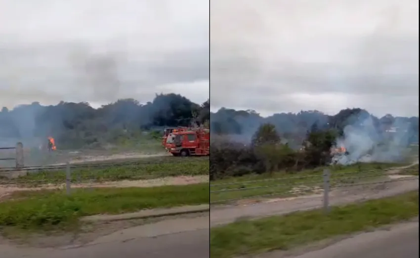 Según se puede ver en el material fílmico entregado a Diario TAG, al menos intervinieron dos camiones hidrantes para sofocar la quema de pastizal dada al final del camino.