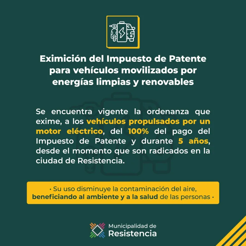 El Municipio de Resistencia recuerda que está vigente la Ordenanza 13.955; por la cual el Concejo Municipal dispone la promoción del uso de vehículos movilizados por energías limpias y renovables a través del período de gracia dispuesto en el mismo texto.