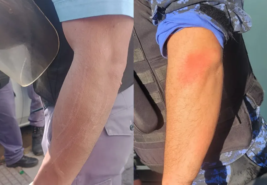 Debido a los ataques con los objetos contundentes dos policías resultaron lesionados, uno con excoriaciones y hematomas en brazo derecho y el otro con excoriaciones y hematomas en ambos Brazos.