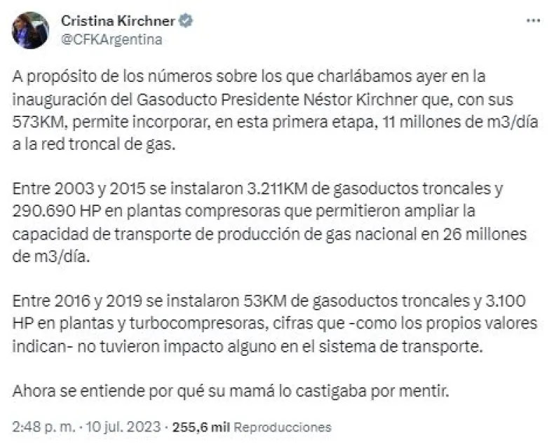 Finalmente, para cerrar su mensaje, manifestó: "La historia de este gasoducto (disculpen si no lo llamo por su nombre oficial) es otro ejemplo de las oportunidades, los millones y el tiempo que perdimos los argentinos por la obstinación del kirchnerismo de destruir cualquier cosa que estuviera hecha por nosotros. Ahora por lo menos tenemos algo concreto. Aprovechémoslo".
