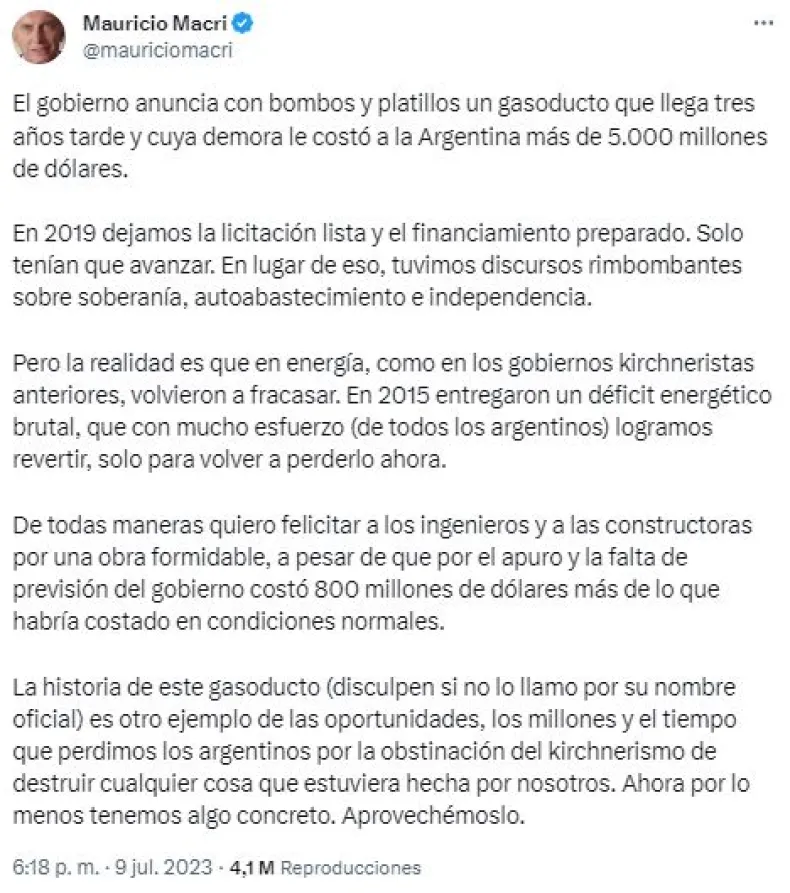 "El gobierno anuncia con bombos y platillos un gasoducto que llega tres años tarde y cuya demora le costó a la Argentina más de 5.000 millones de dólares", sentenció Mauricio Macri en su twitter privado.