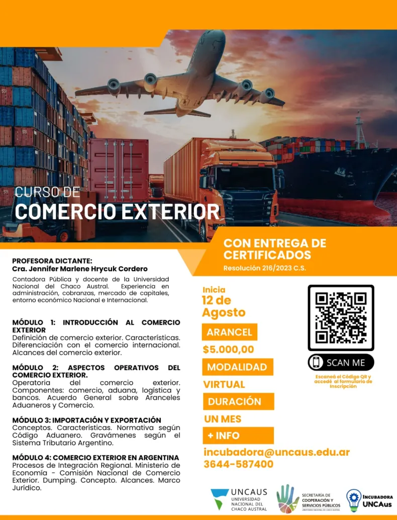 La Universidad Nacional del Chaco Austral, a través de Incubadora UNCAUS, abrió inscripciones para esta nueva propuesta, que posee dictado virtual. Iniciará el 12 de agosto y tiene duración de cursado de un mes. Este curso tiene el objetivo de brindar conocimientos y aspectos sobre los procesos de importación y exportación.