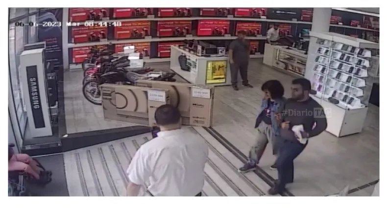 Marcela Acuña y César Sena fueron captados por las cámaras de seguridad de un comercio de electrónicos de Resistencia comprando un nuevo celular, en la mañana del martes 6 de junio, días después del crimen de Cecilia Strzyzoswki.