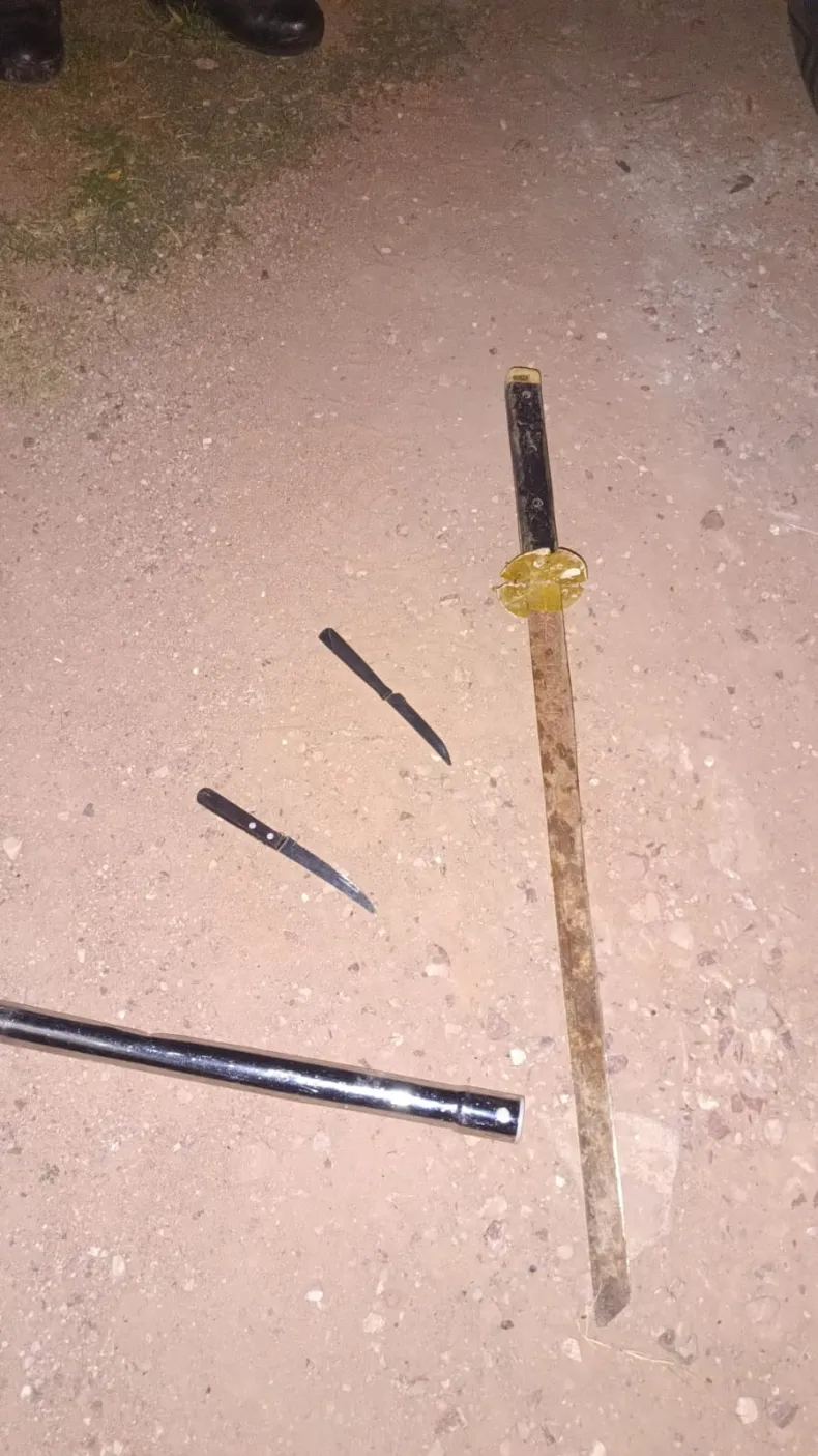 Según informó la Policía, estas personas se encontraban bajo los efectos del alcohol y una vez que fueron detenidos se procedió al secuestro formal de tres armas blancas, entre ellas un cuchillo y una katana junto aun tramo de hierro huevo de 40 centímetros de largo, aproximadamente.