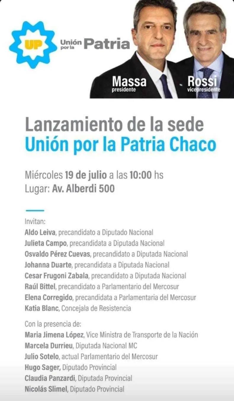 La invitación para este lanzamiento lleva las firmas de los precandidatos a diputados nacionales por el Chaco, en Unión por la Patria, Aldo Leiva, Julieta Campo, Osvaldo Pérez Cuevas, Johana Duarte, César Frugoni Zabala; los precandidatos a parlamentarios del Mercosur, Raúl Bittel y Elena Corregido; y la concejal por Resistencia, Katia Blanc.