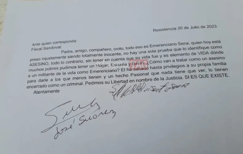 El dirigente social José Suárez, quien está a cargo del movimiento político de la familia Sena, escribió una carta dirigida al "fiscal Sandoval", donde exige la liberación de Emerenciano Sena, quien está detenido por el femicidio de Cecilia Strzyzowski.
