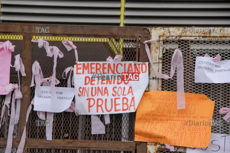 Una vez en la vereda de la fiscalía que está "pintada" de rosa con escritos exigiendo justicia por Cecilia, los piqueteros pusieron sus propios carteles donde exigen la liberación de Emerenciano Sena, en los que plasman las frases: "No más presos políticos"; "Emerenciano Sena detenido sin ni una sola prueba"; "Fuerza Eme Libertad".