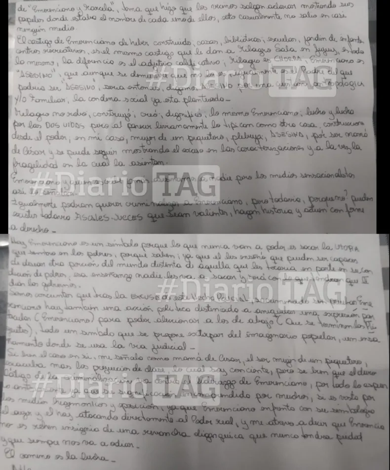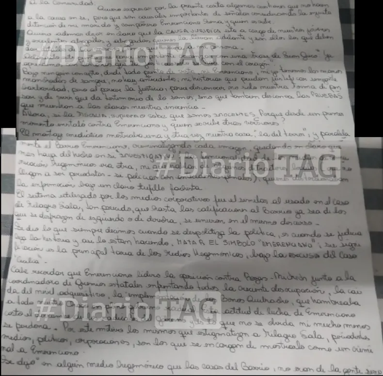 En la tarde del jueves, salieron a la luz nuevas cartas que Marcela Acuña envió a su esposo Emerenciano Sena. El escrito criticó a los medios "hegemónicos" y enalteció la figura del fundador del barrio. Todo esto se conoció en el marco de la manifestación que tuvo lugar en la ciudad de Resistencia donde un grupo reducido de personas pidió la liberación del padre de César Sena.