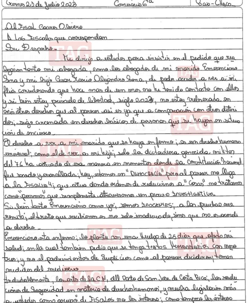 En la carta escrita a puño y letra, también le habla al principal fiscal del caso,Jorge Cáceres Olivera, la imputada insistió en el pedido para poder ver a su hijo y a su familia. "Considerando que hace más de un mes no tengo contacto con mi hijo y con mi familia, estoy privada de la libertad pero no vulnerada de mis otros derechos pero al parecer si", escribió.