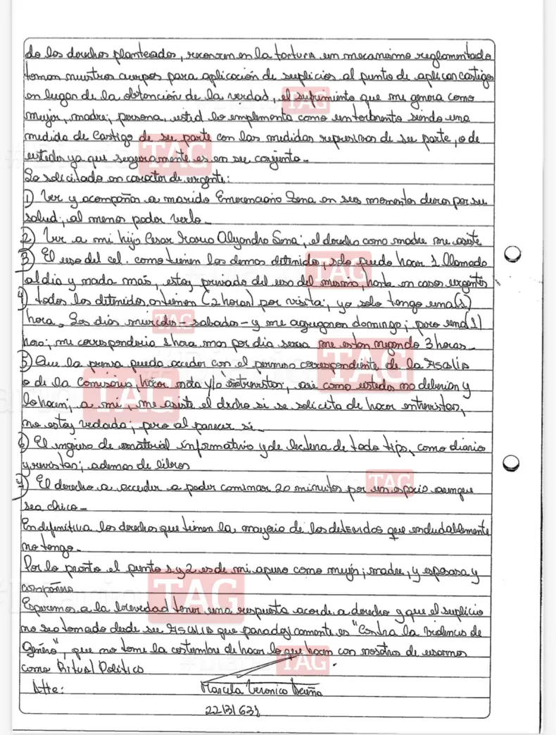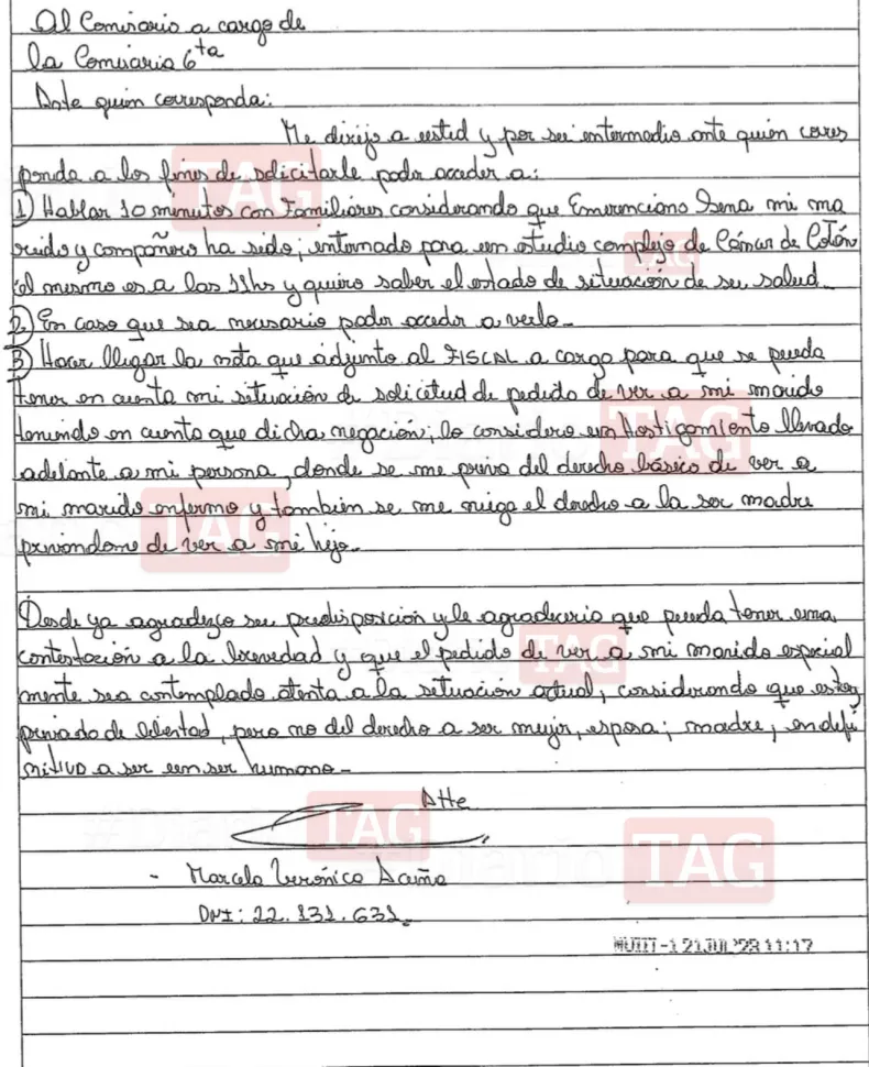 Acuña enumera, nuevamente, una serie de pedidos donde manifiesta querer acompañar y ver a su marido y a su hijo. Además asegura que quiere acceder al uso de celular ya que "solo puede hacer 1 llamada al día".