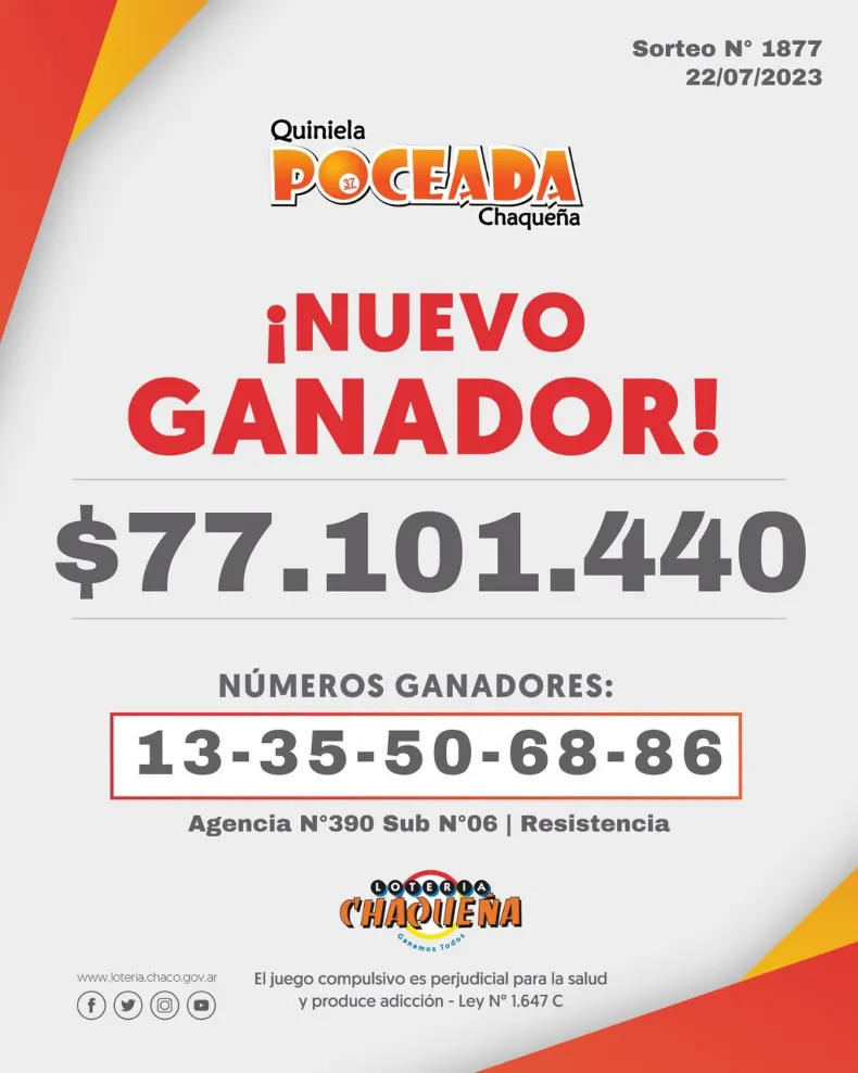 Hay un nuevo millonario en Resistencia tras el sorteo de la Quiniela Poceada Chaqueña en la noche de este sábado, que se consagró con un pozo acumulado de más de 77 millones de pesos.