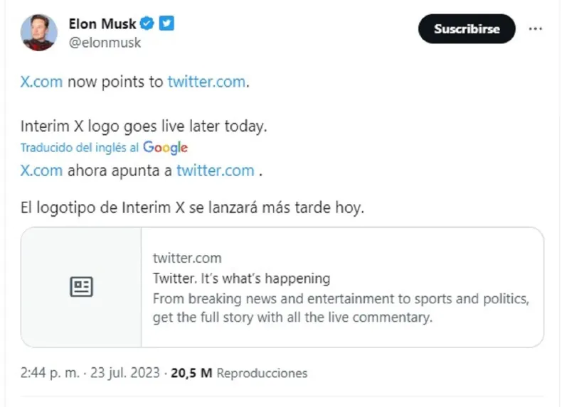 En la madrugada del domingo, Musk adelantó que planeaba hacer el cambio en las próximas horas. "Y pronto diremos adiós a la marca Twitter y, gradualmente, a todos los pájaros", escribió en su cuenta.