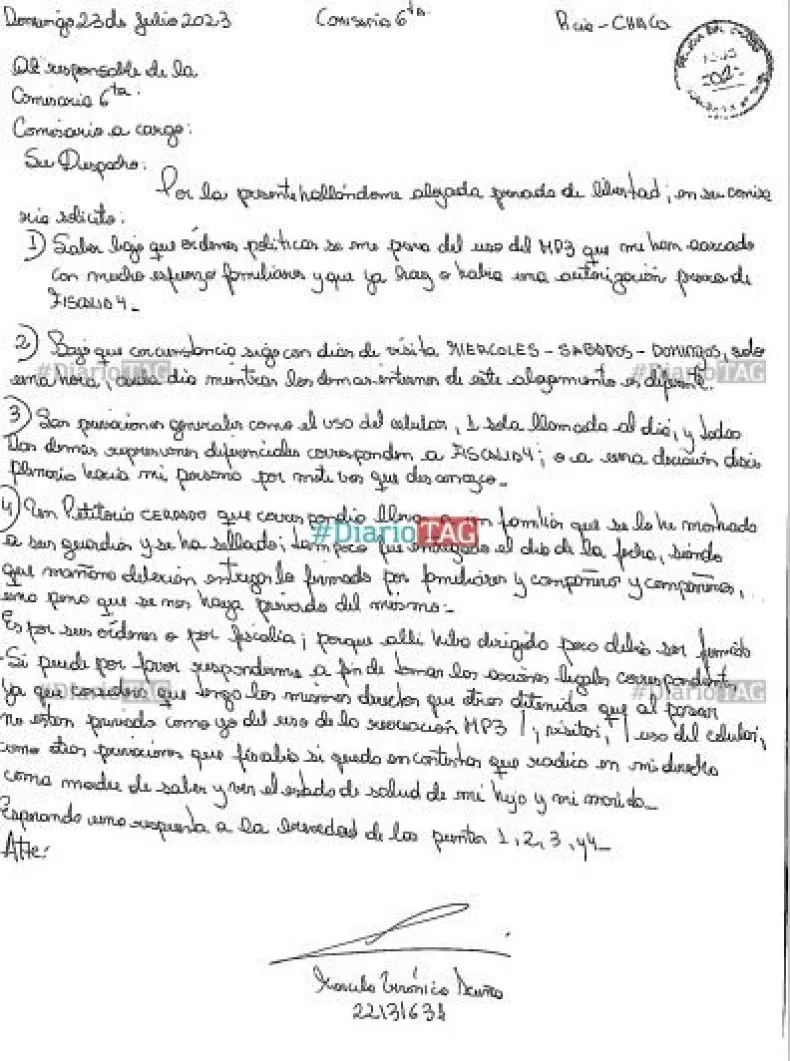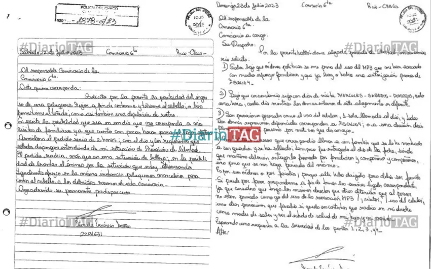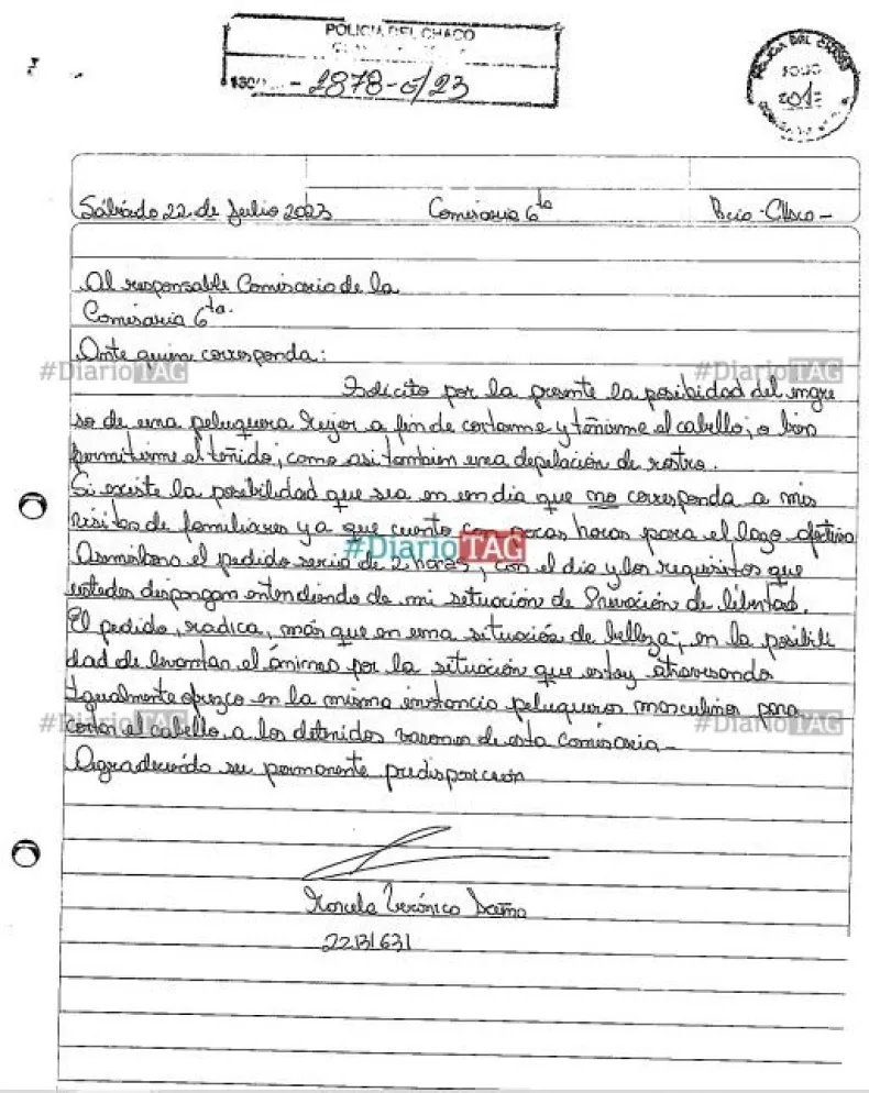 La primera carta es del sábado 22 de julio, allí Acuña realiza varios pedidos personales, "solicito la posibilidad de ingresar una peluquera mujer a fin de cortarme y teñirme el cabello, como así también una depilación de rostro", dice el texto, donde exige, además, que "sea en un día que no corresponda a mis visitas de familiares ya que cuento con pocas horas para el lazo afectivo".