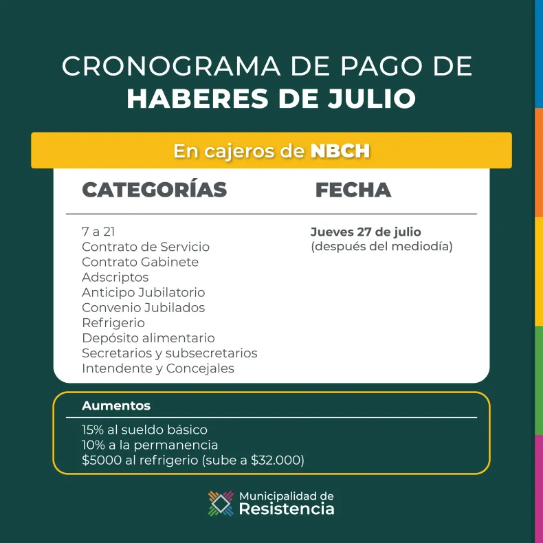 El Municipio de Resistencia realizará este jueves 27 de julio el pago de haberes correspondientes al corriente mes al personal municipal, después del mediodía.