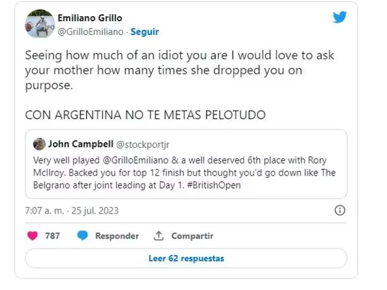 El chaqueño, de 30 años desató su furia contra un usuario de Twitter que le escribió un mensaje relacionado a la historia de nuestro país: "Muy bien jugado Emiliano Grillo y un merecido sexto lugar con Rory McIlroy. Te respaldé para que terminaras entre los 12 primeros, pero pensé que te hundirías como el Belgrano después de liderar en el Día 1", fue el mensaje.