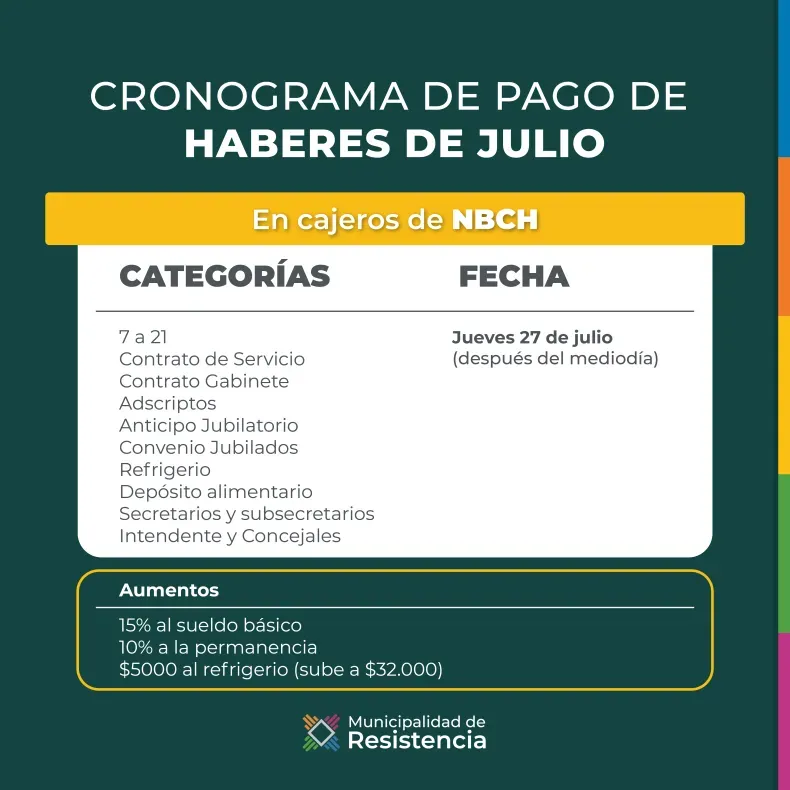 El cronograma establecido es para las categorías: 7 a 21, depósito alimentario, contratados de Gabinete y de Servicios, anticipo jubilatorio, convenios jubilados, depósito judicial, adscriptos, secretarios y subsecretarios, concejales e intendente.