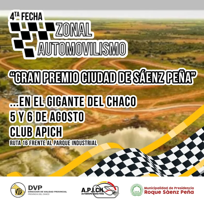 Desde la Municipalidad de Sáenz Peña anunciaron la realización de la cuarta fecha del automovilismo zonal, que será el 5 y 6 de agosto en el autódromo del Club Apich (Asociación de Pilotos del Interior Chaqueño) ubicado frente al Parque Industrial sobre ruta 16. La presentación tuvo lugar en la mañana del viernes en el Centro Cultural Municipal.