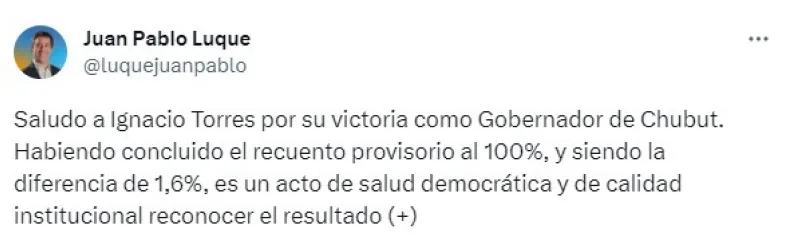Escribió en su cuenta personal de Twitter: "Saludo a Ignacio Torres por su victoria como Gobernador de Chubut. Habiendo concluido el recuento provisorio al 100%, y siendo la diferencia de 1,6%, es un acto de salud democrática y de calidad institucional reconocer el resultado (+)".